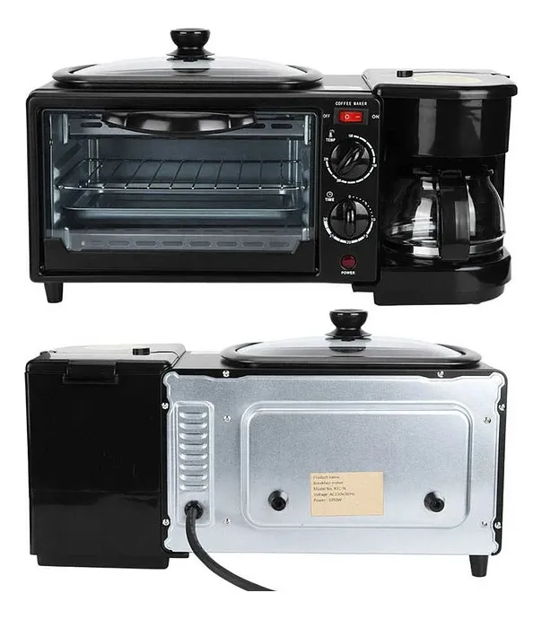 El Horno Eléctrico Tostador Sokany Cafetera Parrilla 3 En 1 es la solución ideal para quienes buscan maximizar el espacio en su cocina sin sacrificar funcionalidad. Con un diseño compacto, este modelo de mesa es perfecto para cocinas pequeñas. A pesar de su tamaño, ofrece una capacidad en volumen de 1 L, permitiendo preparar una variedad de platillos. Su función de grill asegura que los alimentos queden dorados y crocantes, ideal para pizzas, quesadillas y arepas. Aunque no cuenta con convección ni funciones de microondas o autolimpieza, su diseño práctico y eficiente garantiza una experiencia de cocción óptima. Además, su etiqueta de eficiencia energética asegura un uso responsable de la energía. Con el Horno Sokany, disfrutarás de la comodidad y el sabor en cada comida.Máquina De Desayuno 3 en 1